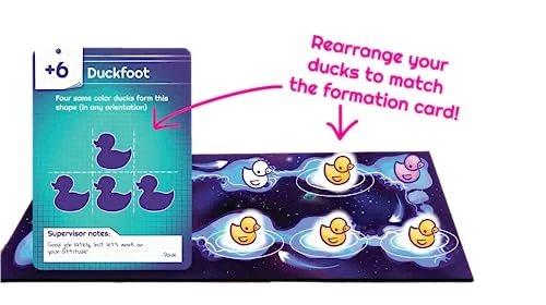 - WHAT’S INCLUDED: 80 adorable plastic ducks, 3D flexible UFO, 4 player boards, Action Cards deck, Formation Cards deck