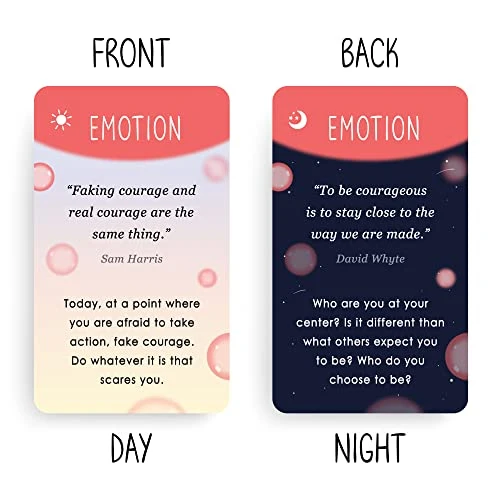 - 🗂️ 6 CATEGORIES FOR DAY & NIGHT 🗂️ As part of your morning routine, read a motivational quote and challenge to build the best version of your Self! At night, flip the card and read a powerful quote with a deep reflection question. Go beyond oracle decks and positive affirmations with diverse categories, like Mindfulness, Life, Emotions, Stoicism, Zen, and The Idea Space. Each category provides a varied experience aimed at bringing out your best Self!