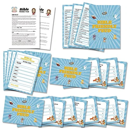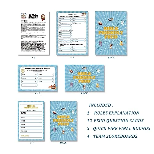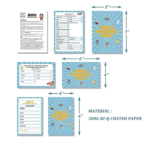 - Dimensions – 5×7 inches for rules explanation card and final round card, 4×6 inches for feud question card and team scoreboard.