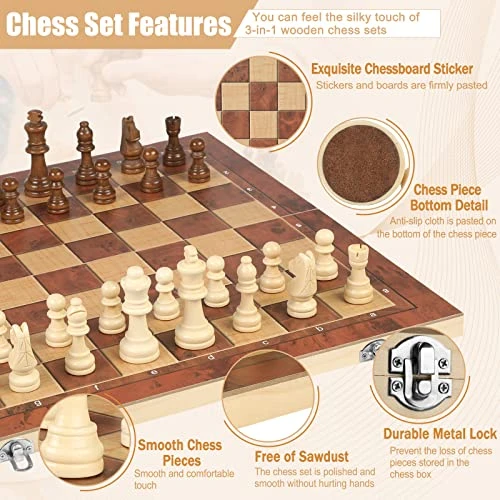 - 【EXQUISITE WORKMANSHIP】The surfaces of the wooden chess set is all carefully polished and processed, you can get a silky smooth feel. The chessboard box is pasted with exquisite checkerboard grid stickers. The board game set contains 32 wooden chess pieces, 30 checkers pieces and 2 exquisite plastic mini dices.