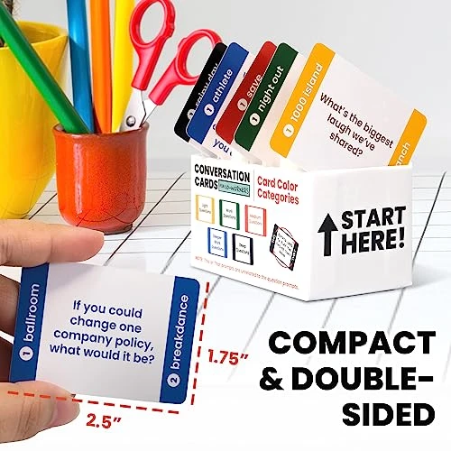 - Compact and Double-sided – These icebreaker question cards are 2.5″ x 1.75″, double-sided to use less paper, and fit in a portable 3″ x 2″ x 2″ box. Keep these connection cards at your desk or in the breakroom to start engaging conversations. Use these icebreaker cards as a teambuilding activity to create connection and have fun at the office or virtually. These conversation starter cards are great for bonding during virtual meetings, retreats, new hire onboarding, or training sessions.