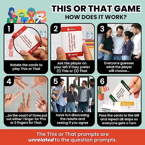 - 2 Games in 1 – Includes 400 Open-ended Questions and 400 This or That Game Prompts – Breaking the ice, especially at work, can be difficult. Ease into deeper conversations by playing This or That first! As a group, guess if a team member will pick This or That (the words on the sides of each card) as their preference. Learn about each other and prepare to be surprised! With two get to know you games, you can play a lighter, sillier game to get warmed up or jump into fun open-ended questions.