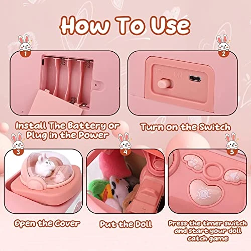- 【Easy To Use】To Get Started, Please Turn The Switch ON The Back To ON Position. Then, Press The 60 Second Time Limit Button, Move The Joysticks Up, Right, Left Or Down To Catch Your Selected Prize.The Claw Of The Claw Machine Toys Is Powerful And Flexible, Rotating 360 Degrees To Easily Grab The Prizes.