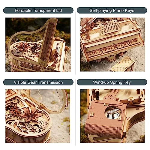 - 【SELF-PLAYING KEYS】ROKR Piano model kit is driven all by gear transmission instead of battery. Just fully wind up the spring-key behind the cello, then its keys will automatically play beautiful tune for audience.