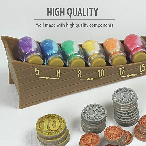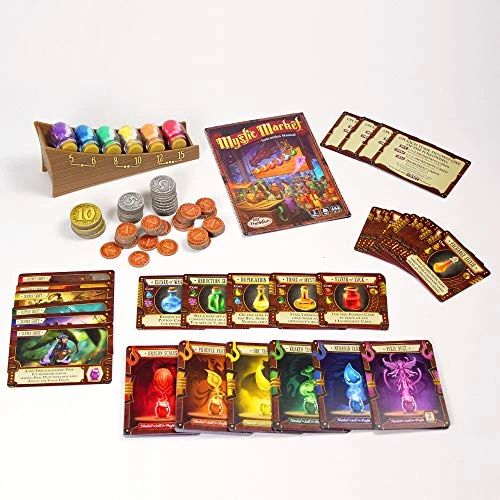 - What you get – Mystic Market comes with 6 ingredient vials, 1 value track, 66 ingredient cards, 20 potion cards, 6 supply shift cards, 4 reference cards and an instruction manual.